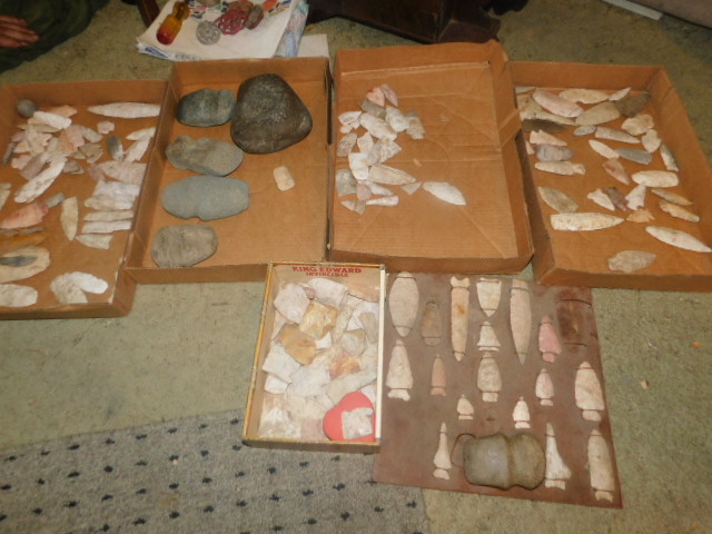 GUNS, COINS,JEWELRY & INDIAN ARTIFACTS: NOBLE MODEL 33-A .22 CAL. PUMP RIFLE; STEVENS MODEL 87 D .22 CAL. SEMI AUTO RIFLE; 1880 $10 GOLD COIN; 47 WASHINGTON SILVER QUARTERS; 62 SILVER DIMES; 9 40% SILVER HALVES; ’64 JFK HALVES; 5 FRANKLIN HALVES; 4 WALKING LIB. HALVES; 1 PEACE DOLLAR; 4 MORGAN DOLLARS; 1900 MORGAN S DOLLAR; 3 SEATED LIB. HALVES; 1 OUNCE SILVER EAGLE; MISC. US COINS; 10K GOLD RING; 18 K GOLD RING; GOLD JEWELRY; 100+ INDIAN ARTIFACTS INCLUDING POINTS, AXE HEADS, SCRAPERS, CELTS, DRILLS, SPEARS & PIECES; 5 ELGIN POCKET WATCHES; WATHAM POCKET WATCH; 21 &15 JEWEL POCKET WATCHES; ASSORTMENT OF COSTUME JEWELRY; 9 ONE DOLLAR SILVER CERT.
